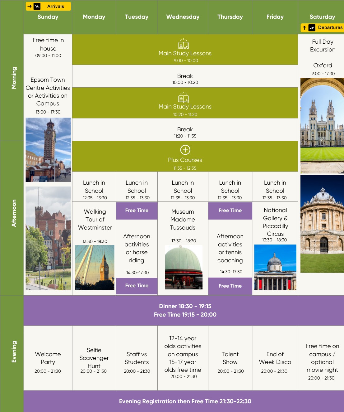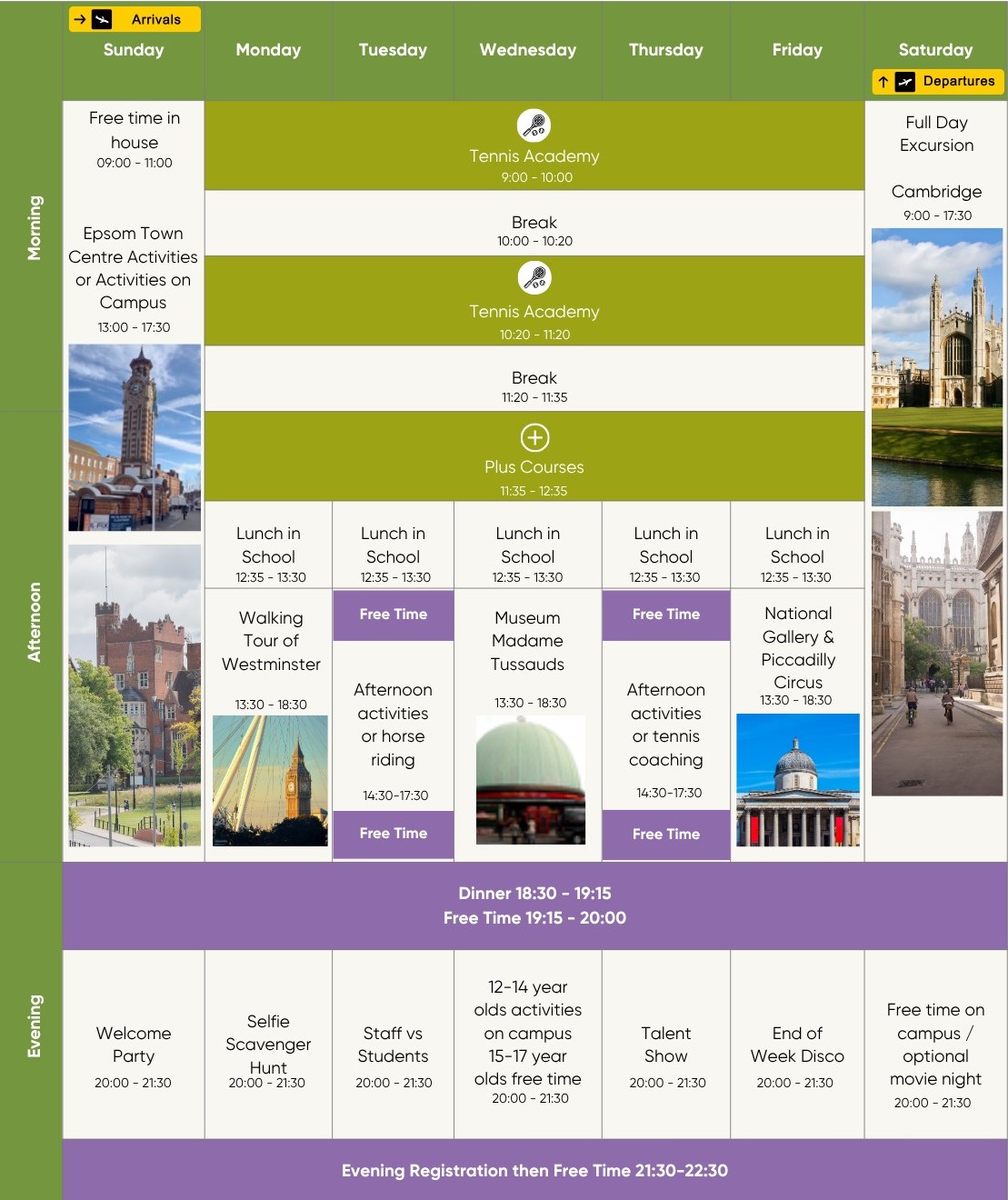 - 1 екскурсія на цілий день на тиждень і 3 екскурсії на півдня до Лондона: у 2, 3 і 4 тижні одна екскурсія на півдня буде до Тенісного музею Вімблдону